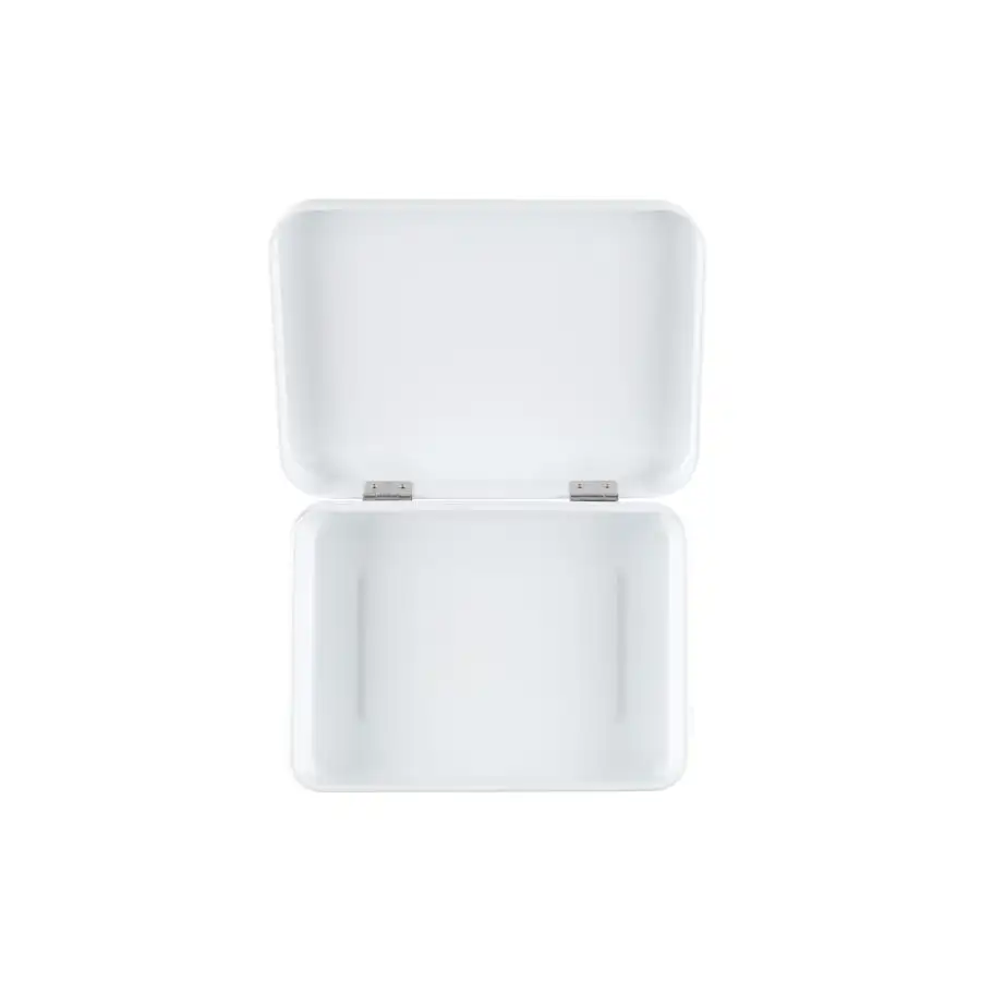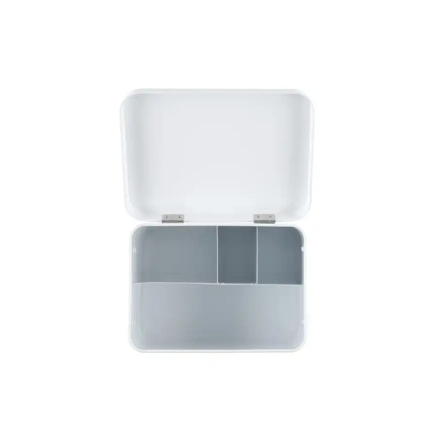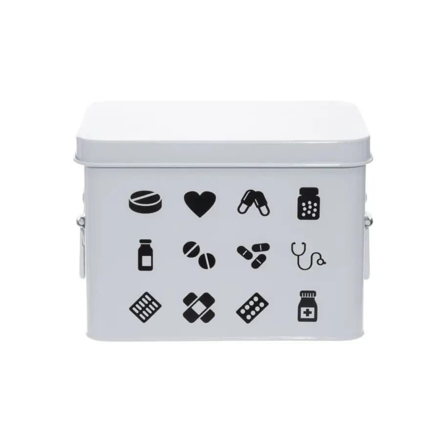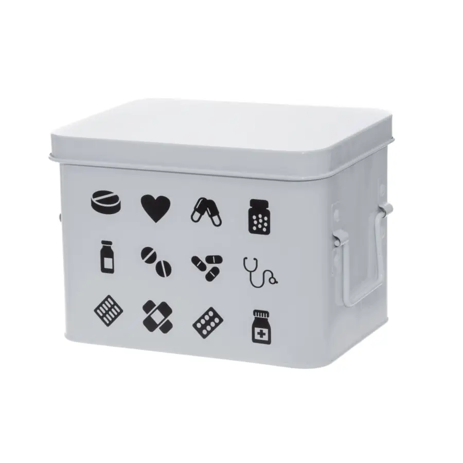 Metal medicine box for storing medicines and first aid supplies. The box has one larger compartment and three smaller ones. Keep the box out of the reach of children or pets.
