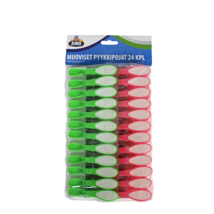 Aino Rubber Clothespin are made of plastic. The rubber surface guarantees a strong hold. The package contains 24 pieces of clothespins.