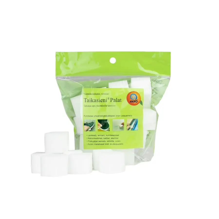 Original Magic Mushrooms® Pieces are an effective aid for individual stains. The Taikasieni® Palat bag contains 20 pieces of 3×3 cm pre-cut pieces with which you can conveniently and completely clean individual stains from different surfaces without detergents. When cleaning all surfaces, always try carefully on a small, inconspicuous area first. All original Taikasieni® Pieces are produced responsibly.