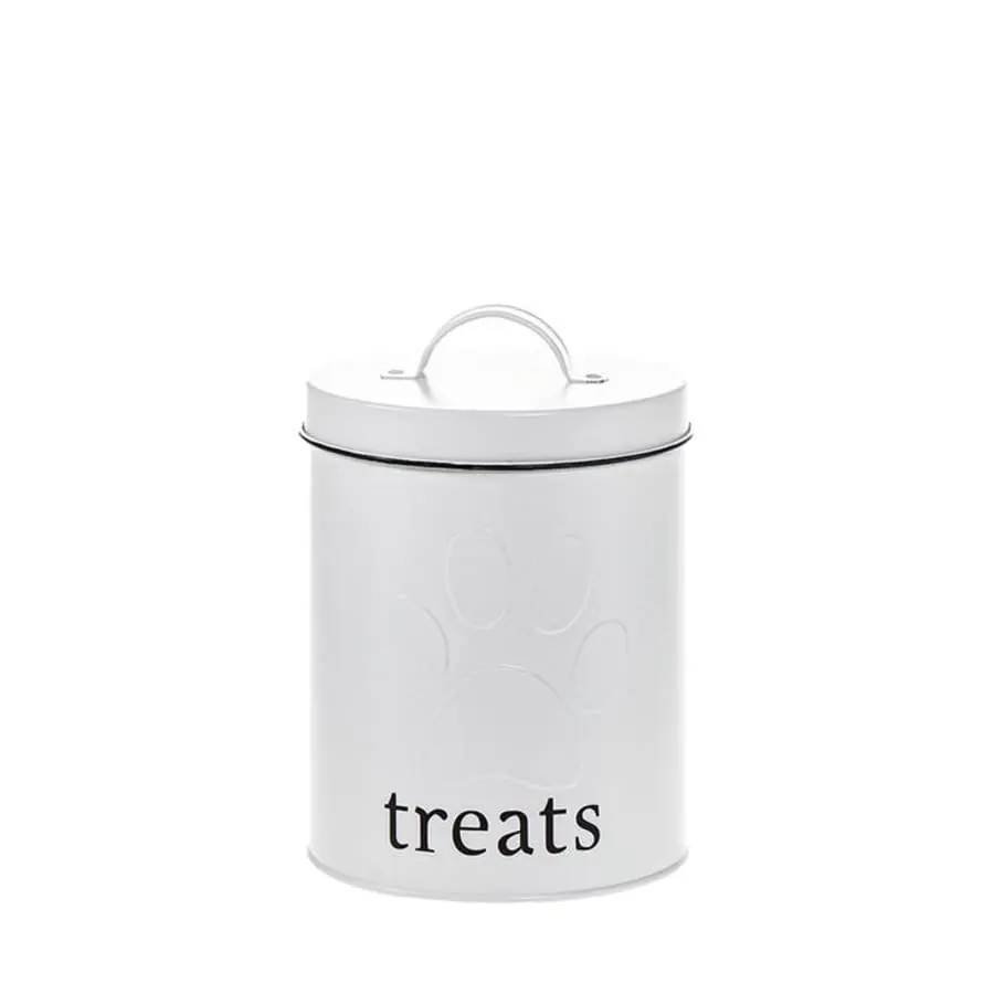 White pet food jar with metal lid. Size 13.5×13.5×17.5cm.