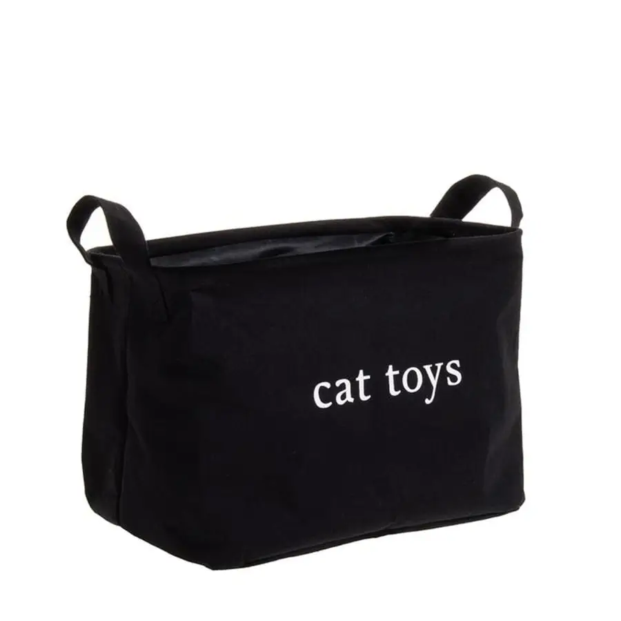Black stylish storage basket for cat toys. The text cat toys on the side. Size 35x25x25cm.