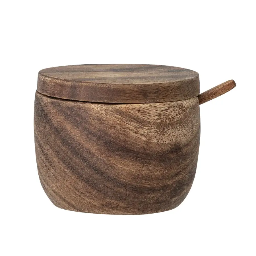Eliva is a container with a lid made of acacia wood that includes a spoon made of the same material. When opening, the cover is pushed aside, it does not come off. The dish is suitable for e.g. salt, sugar or jam.