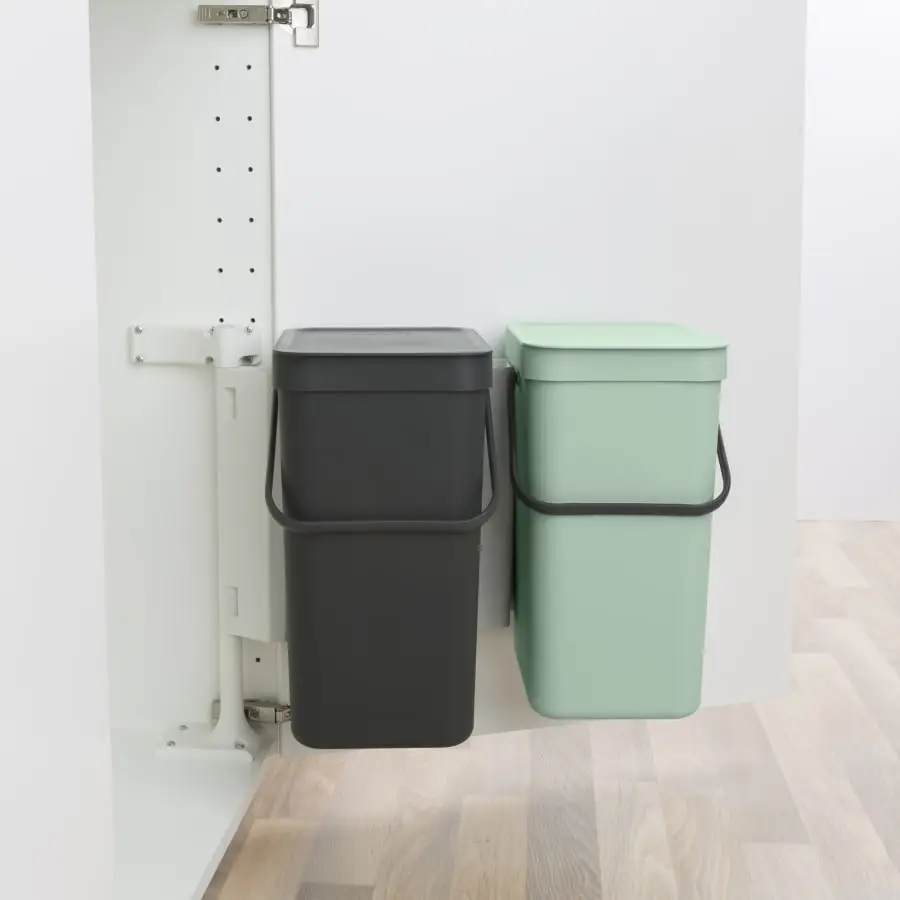 No floor space to spare for a bin? No problem! Use the 2 x 12 litre Brabantia Sort & Go Recycle Built-in Bin. This duo fits in cupboards, whether the doors open to the left or right. When they do, the bins come out – smooth! They come with a sturdy self-supporting mounting frame, fixings and a clear instruction manual. And of course they are easy to clean, take out of their frame and empty too. Built-in for waste separation!