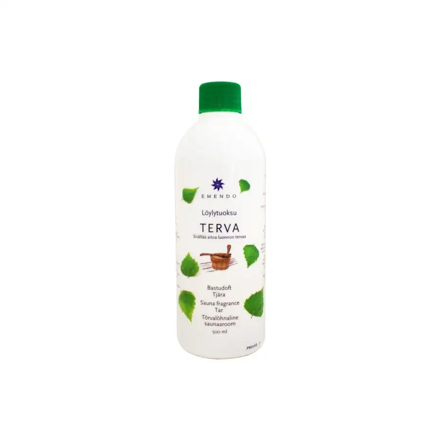 Sauna fragrance Tar in a bottle of 500 ml. Emendo sauna fragrances add a pleasant scent to the sauna and make the sauna experience even more enjoyable. Contains natural tar. Does not contain synthetic parfumes. Add ½ dl of sauna fragrance to water (3 l), throw over the hot stones of the sauna stove, enjoy the aroma and relax.
