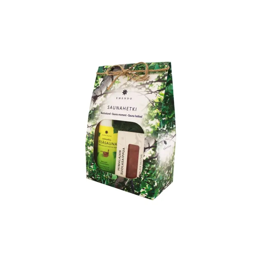 Emendon’s Sauna moment set contains Summer sauna 250 ml sauna fragrance, green washing flower and Himalayan salt soap 240 g.