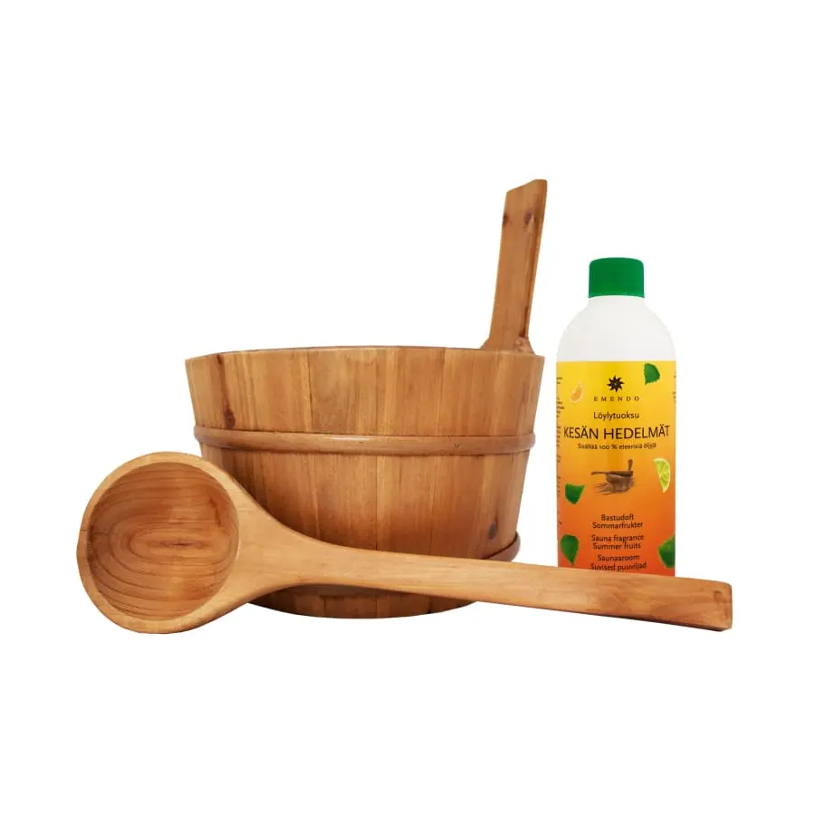 The stylish kiule set includes a wooden kiule and a ladle, as well as Löylytoukku Kesen Hedelmät 500 ml.