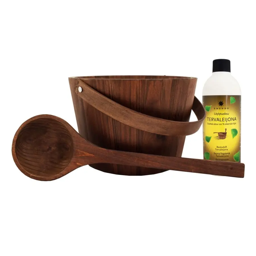 Stylish brown wooden sauna bucket and ladle and Tarvaleijona 500 ml sauna scent.