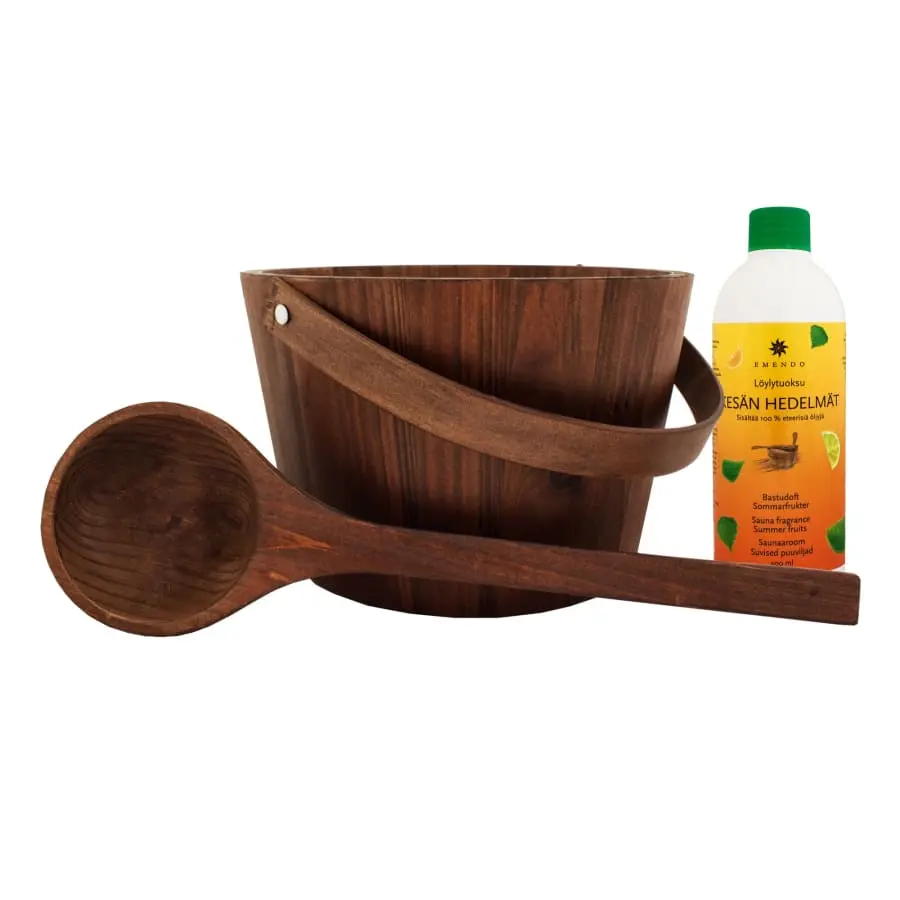 The stylish kiulu set includes a wooden, brown sauna scoop and a bucket, as well as Löylytoukku Kesen Hedelmät 500 ml.