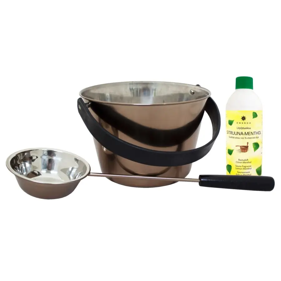 The stylish keel set includes a steel smoky gray sauna scoop and bucket, as well as a Lemon-Menthol 500 ml sauna scent.