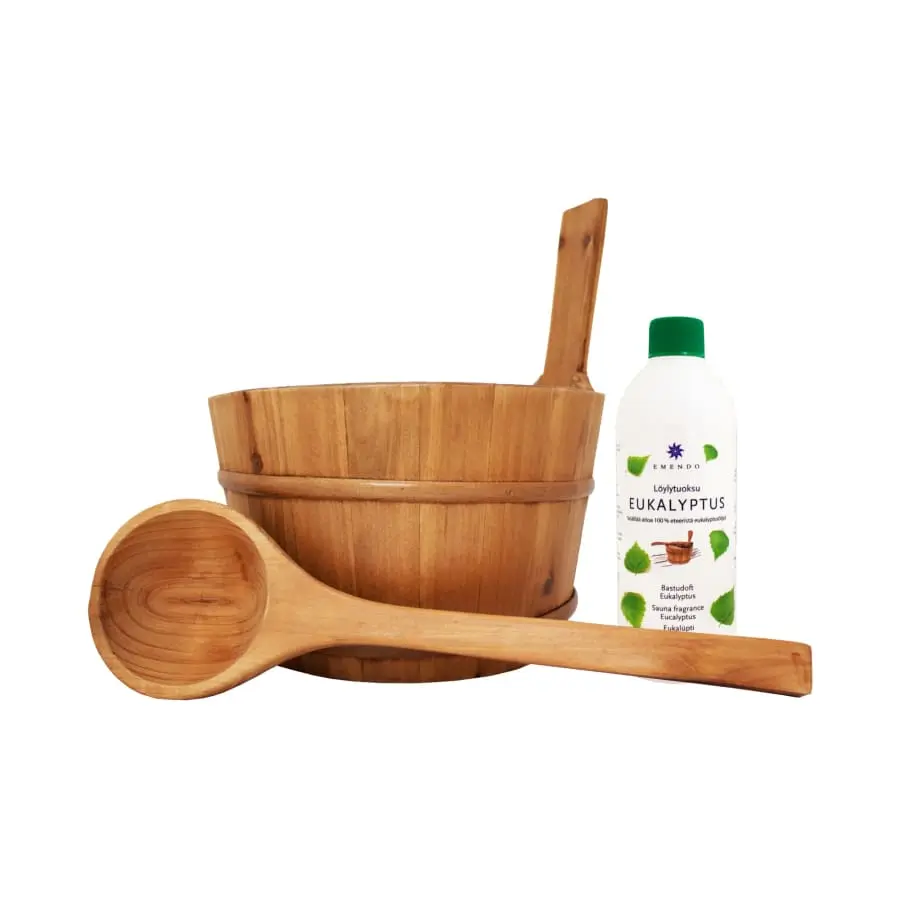 The set includes a wooden sauna bucket, ladle and sauna fragrance Eucalyptus 500 ml. The sauna bucket has a plastic water basin inside.