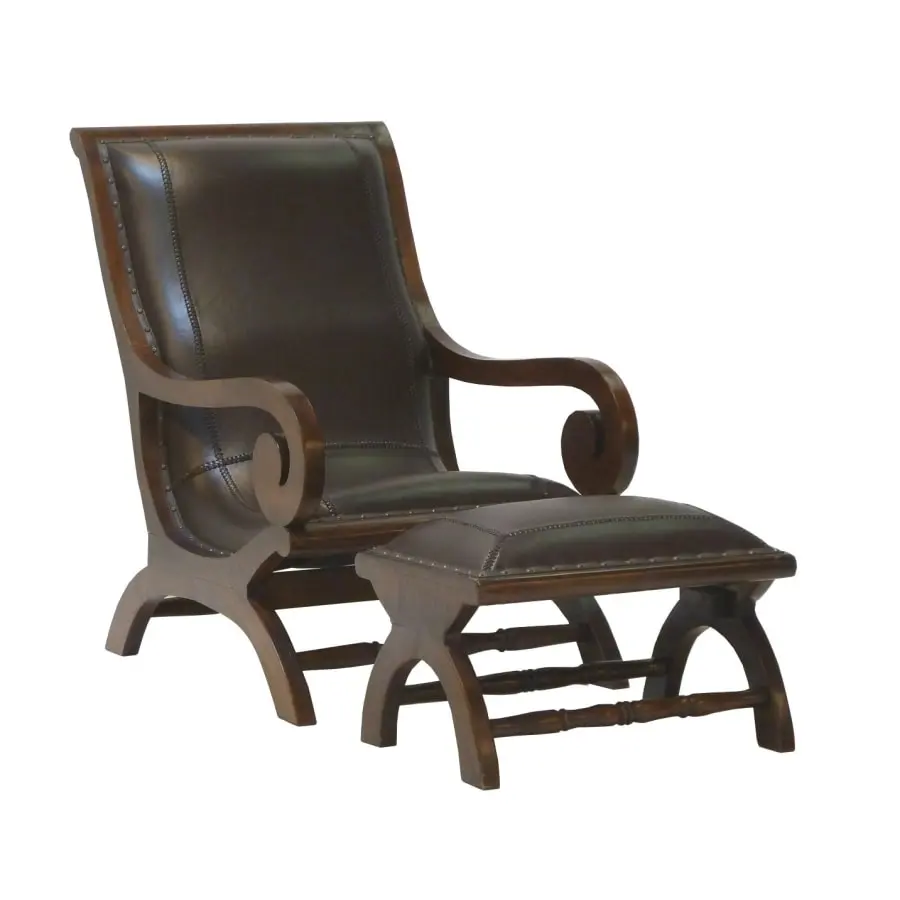 En högkvalitativ fåtölj av teak och läder med en spjäl som samlingspunkten i vardagsrummet. Fåtölj L60,5 x B90x H90 cm. Rahin L53,5 x B40 x H35 cm. Sitthöjden på solstolen är 32 cm. Rygghöjd 70 cm.