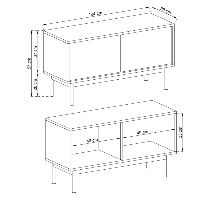 Stylish and modern Milo TV stand. The TV stand has an oak-colored 18 mm laminated furniture board frame, gray front sets, ABS edge band and black painted wooden legs. The TV stand has two cabinets with doors, the doors of which have a push-to-open mechanism. The width of the TV stand is 104 cm, depth 39 cm and height 57 cm. Delivery in parts.