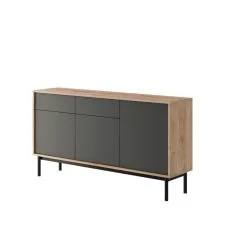 Stilren och modern Milo skänk med gott om förvaringsutrymme. Skänken har en ekfärgad 18 mm laminerad möbelskivstomme, grå frontset, ABS kantlist och svartmålade träben. Skänken har två lådor och tre skåp med mellanliggande hyllplan inuti. Dörrarna och lådorna har en push-to-open-mekanism. Dess bredd är 154 cm, djup 39 cm och höjd 84 cm. Leverans i delar.