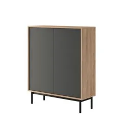 Stilrent och modernt Milo-skåp med gott om förvaringsutrymme. Skåpet har en ekfärgad 18 mm laminerad möbelskivstomme, grå frontset, ABS kantlist och svartmålade träben. Skåpet har två luckor och två breda mellanhyllor inuti skåpet. Dörrarna har en push-to-open-mekanism. Skåpets bredd är 104 cm, djup 39 cm och höjd 126 cm. Leverans i delar.