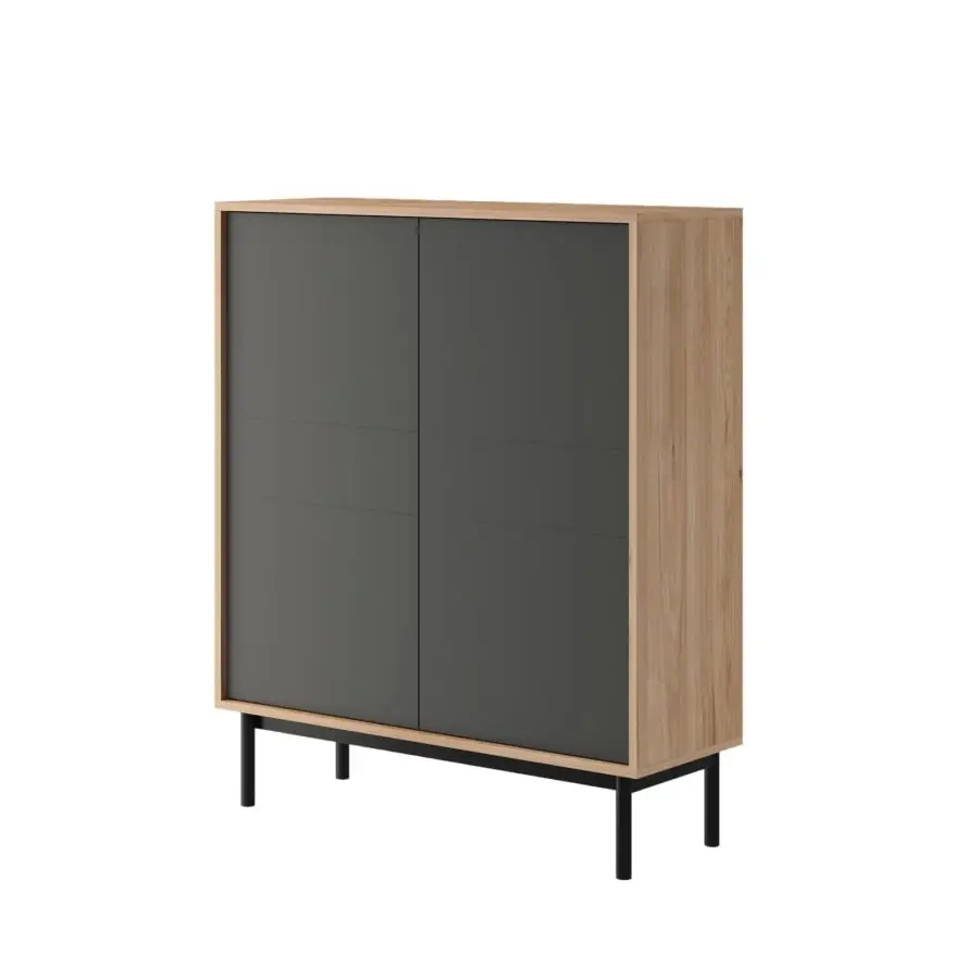 Stylish and modern Milo cabinet with plenty of storage space. The cabinet has an oak-colored 18 mm laminated furniture board frame, gray front sets, ABS edge strip and black painted wooden legs. The cabinet has two doors and two wide intermediate shelves inside the cabinet. The doors have a push-to-open mechanism. The width of the cabinet is 104 cm, depth 39 cm and height 126 cm. Delivery in parts.