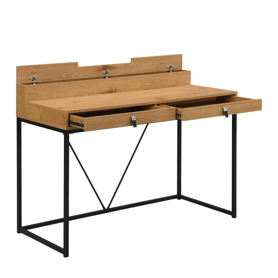 Future desk with black metal legs. Cover part mdf board with paper coating. Two drawers (48x24x4.5) and a storage compartment with a lid.