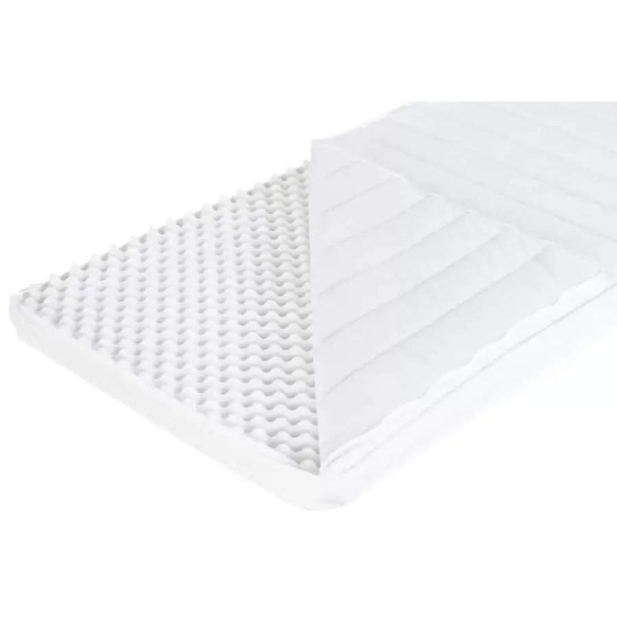 Överdragsmaterialet är tillverkat av högkvalitativ 100% polyesterstickning, en dragkedja på fyra sidor gör det lättare att tvätta överdraget. Ena sidan av fyllningen är slät och den andra sidan är profilerad 100% polyuretanskum. Vänd madrassen regelbundet både på längden och upp och ner, även när du byter lakan, så håller madrassen formen längre. Levereras i rullförpackning.