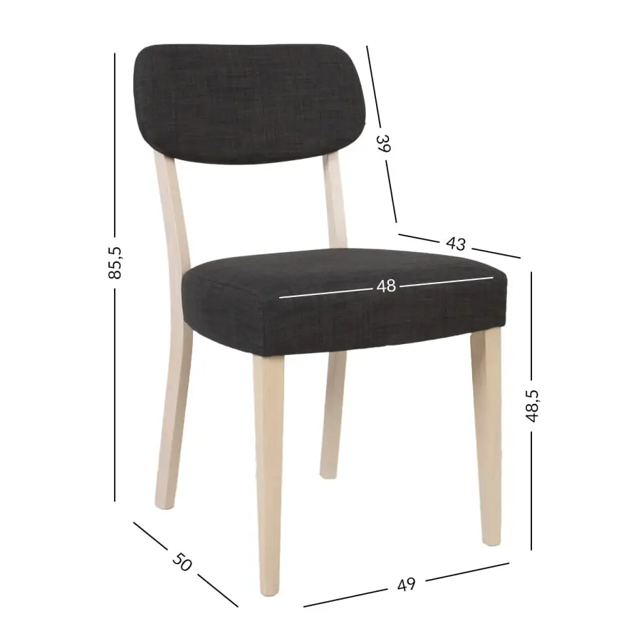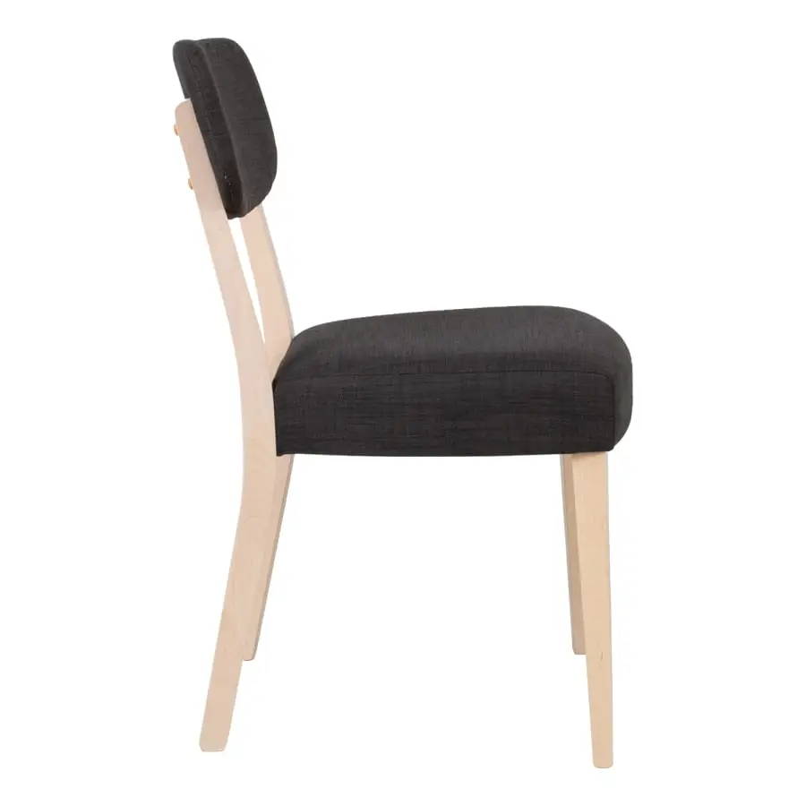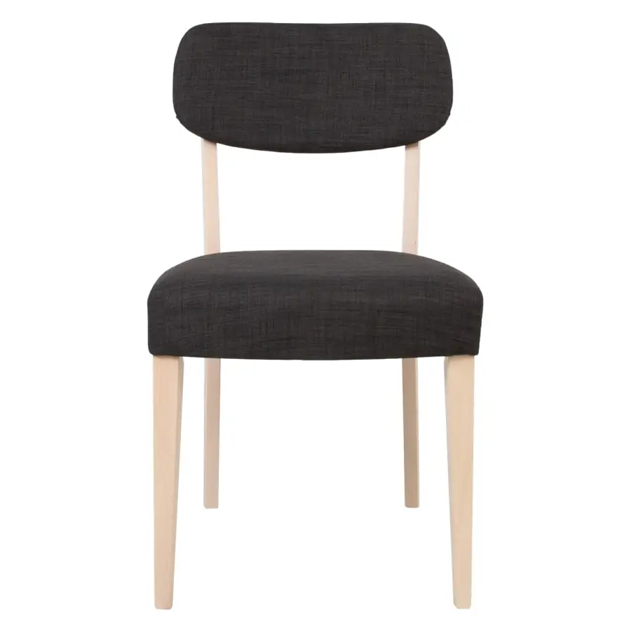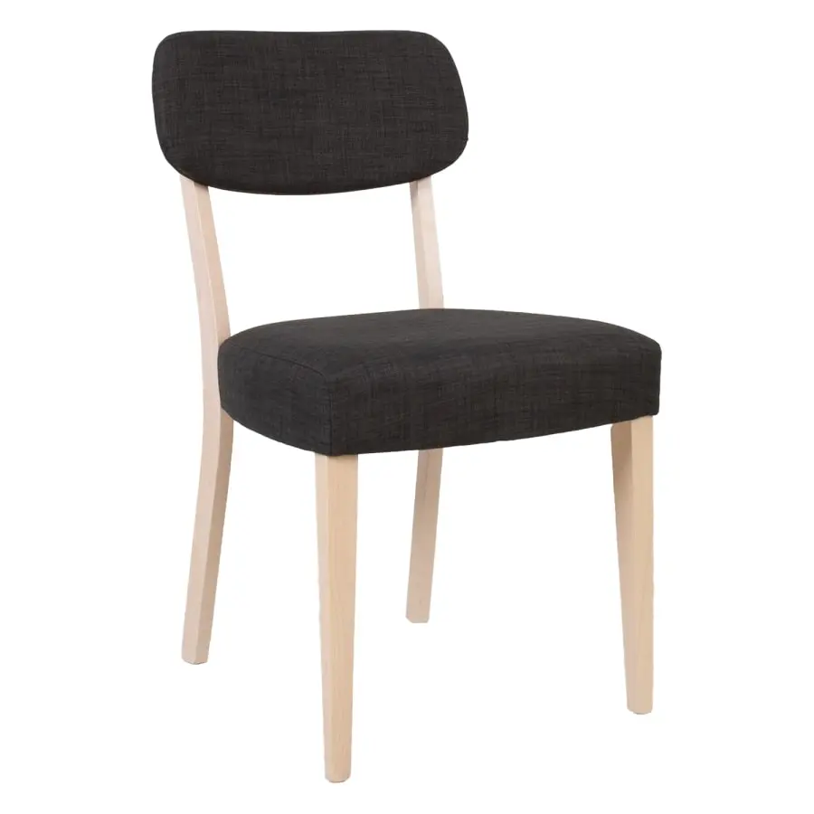 Stylish dining chair Adora, whose seat and back are upholstered in dark gray fabric. The legs and frame are made of beech. The wooden parts are finished with white lacquer in the shade of natural wood.