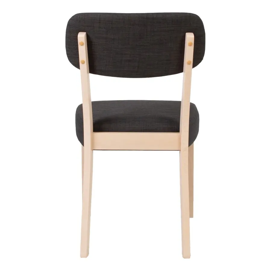 Snygg matstol Adora, vars sits och rygg är klädda i mörkgrått tyg. Benen och ramen är gjorda av bok. Trädelarna är avslutade med vitlack i nyansen av naturligt trä.