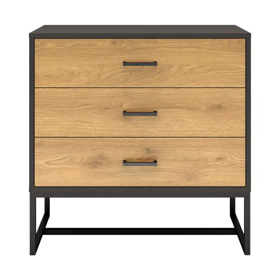 A small chest of drawers as a side table! Three drawers with soft closing. Black metal frame and other parts melamine board. Black aluminum handles.
