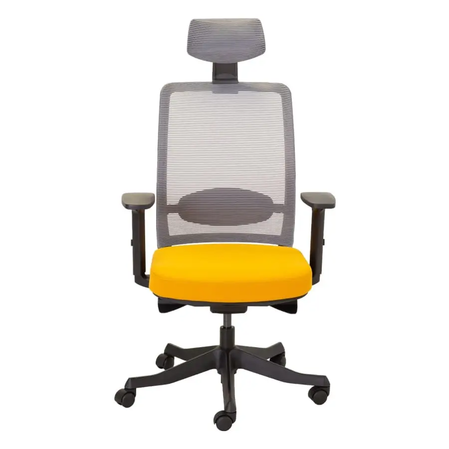 Adjustable office chair with Anggu 5-pronged plastic base. Seat upholstered with polyester fabric, 50,000 Martindale and backrest and headrest covered with polyester mesh fabric, which ensures good air movement. The weight-sensitive synchronous mechanism automatically adjusts the stiffness of the swing according to the weight of the sitter. Adjustable lumbar support. The depth and height of the seat can be adjusted with a gas spring. Black plastic armrests with adjustable height, depth and swivel angle. The height of the headrest is adjustable.