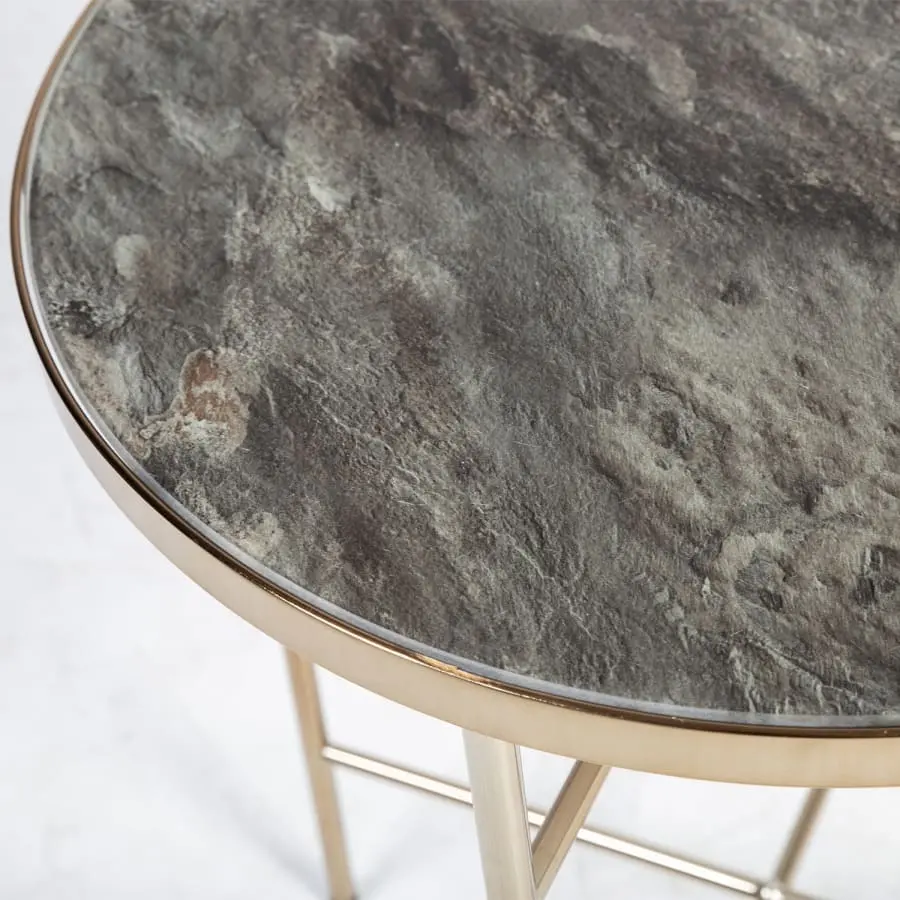 Stylish side table Astoria. Table top marble-colored glass. Legs and body in champagne colored steel.