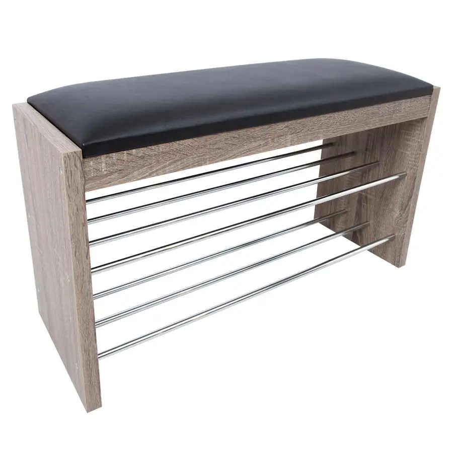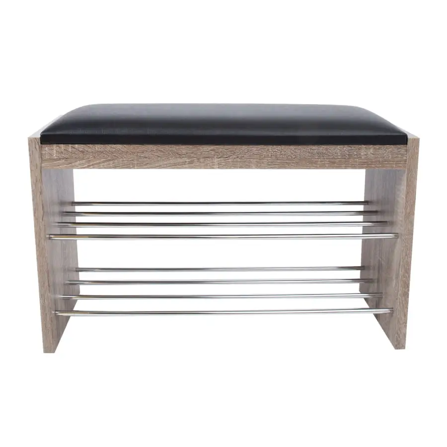 Shoe shelf BENO light brown. A practical shelf is well suited for storing footwear in the hall. The seat on the shelf is upholstered and covered with black PVC material. There are two shelves under the seat for convenient storage of shoes. The shelf is made of oak-decorated laminate board. The steel pipes are finished with a chrome tone.