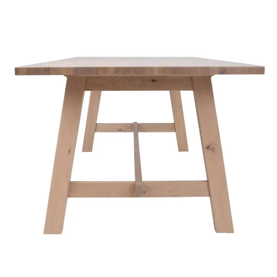 Beautiful light dining table Bergen! Legs made of solid wood and frame with natural oak veneer. The table cover is chipboard with natural oak veneer. The table is finished with white lacquer. It is possible to buy an extension to the table if needed, which gives you an additional length of 45 cm!