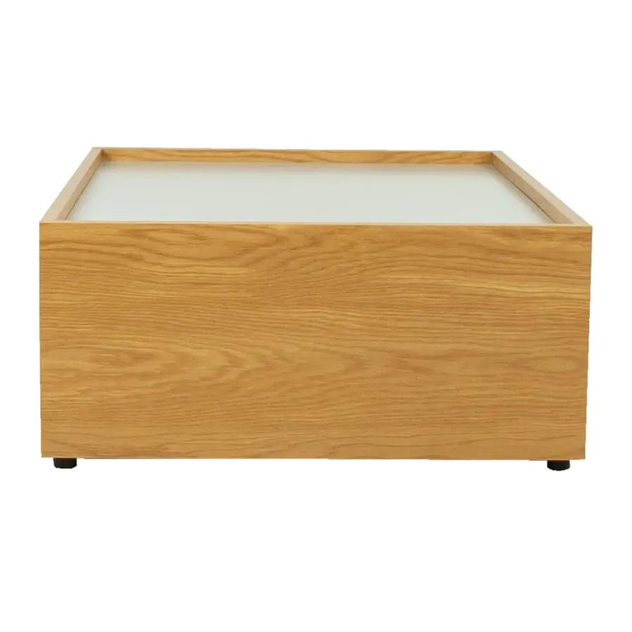 Block soffbord med ett litet öppet fack och förvaringslåda. Vacker ekbrun. Tillverkad av MDF-skiva. Lådan glider på metallskenor.