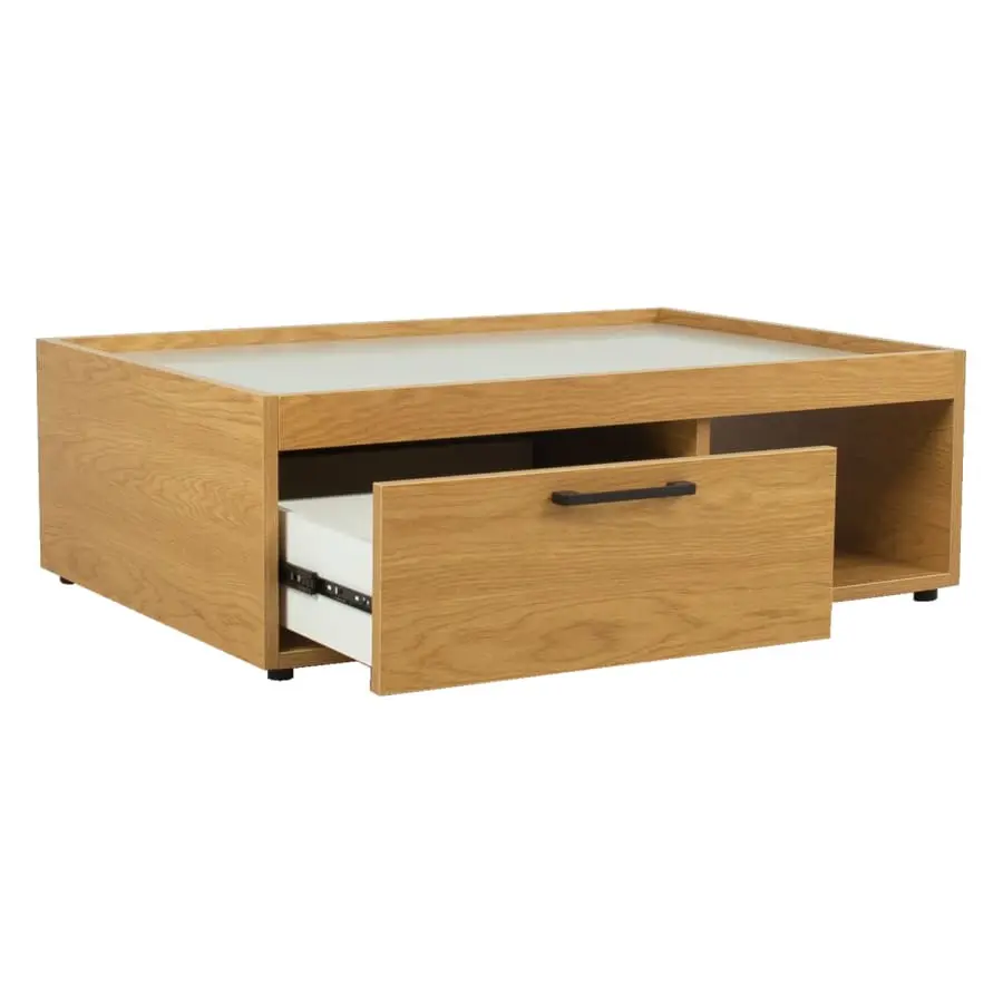 Block coffee table with a small open compartment and storage drawer. Beautiful oak brown. Made of MDF board. The box slides on metal rails.