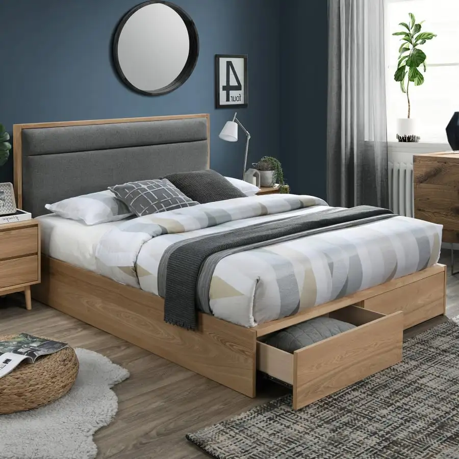 Bed Blossom 160×200 med två praktiska förvaringslådor! Madrassen ingår inte i paketet. Sängramen är gjord av MDF-skiva och klädd med naturlig askfaner och eklack. Vadderad ände täckt med mörkgrått polyestertyg. Det finns 2 lådor på fotsidan av basramen. Sängens fotlister ingår i priset.