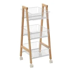 Shelf BREN. The practical triple shelf is well suited for storing items in the hall and in the storage or pantry. The shelf has wheels, so it is convenient to move it. The body of the product is made of solid pine and has a natural tone. The shelf’s three steel wire baskets are coated with powder paint.