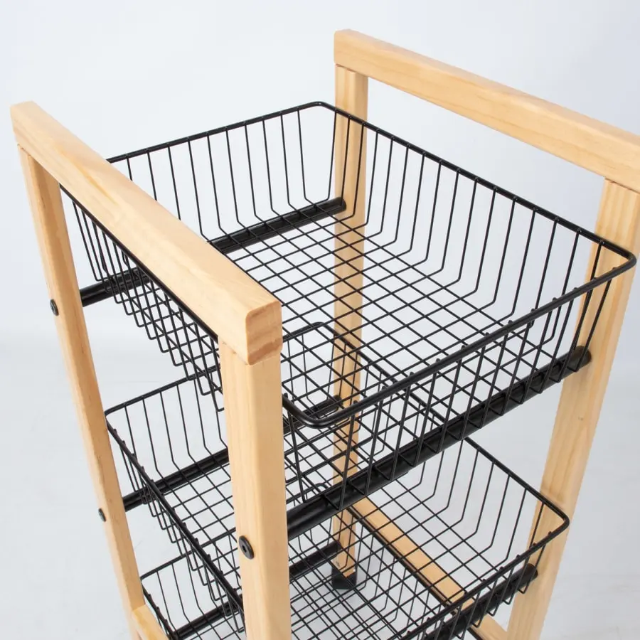 Shelf BREN. The practical triple shelf is well suited for storing items in the hall and in the storage or pantry. The shelf has wheels, so it is convenient to move it. The body of the product is made of solid pine and has a natural tone. The shelf’s three steel wire baskets are coated with powder paint.