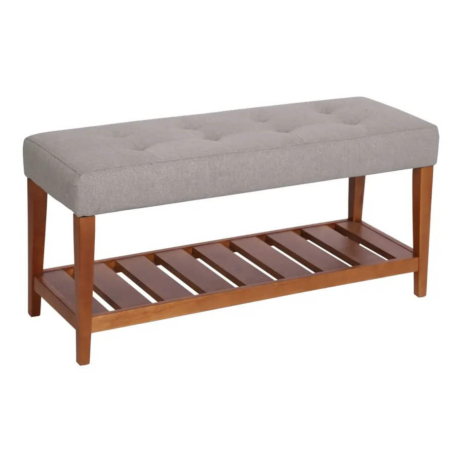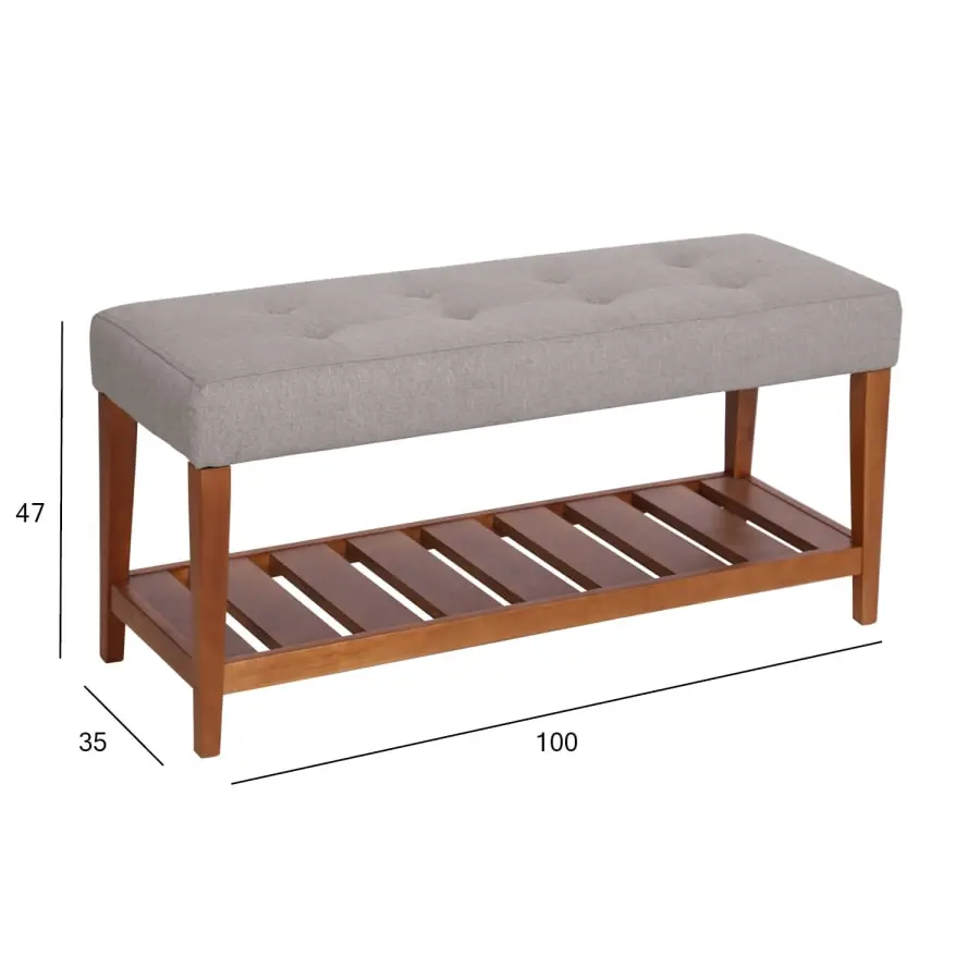 Bench BRIGITA 100×35?H47cm. The comfortable seat is lightly upholstered and covered with gray fabric. Cover material: 100% polyester, Martindale 25,000. Seat frame: metal and plywood. Upholstery: polyurethane foam. The frame is solid birch. Weight limit 100 kg.