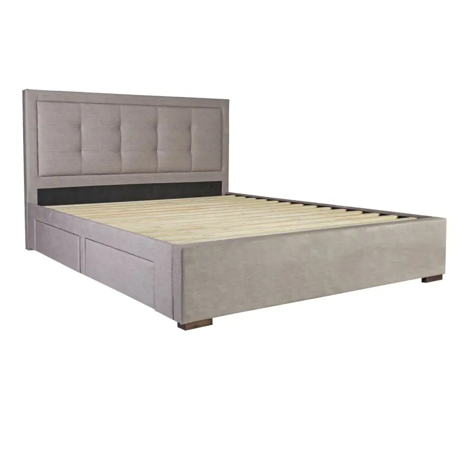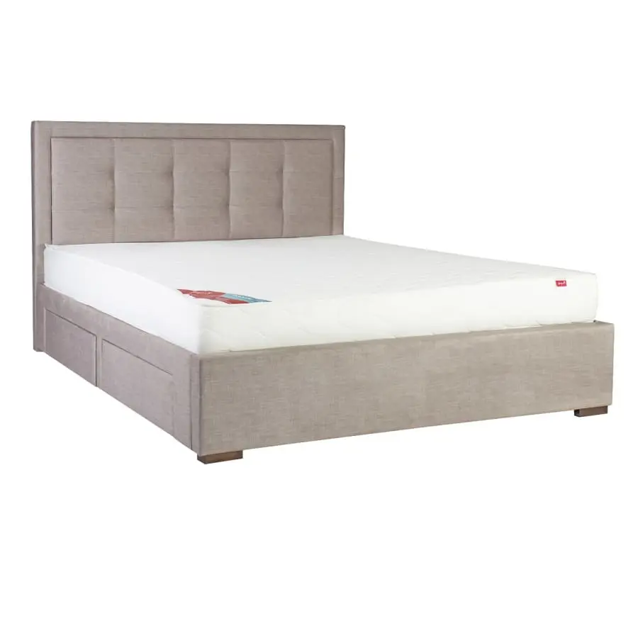 Stylish gray bed Duke 160x200cm. Four lower drawers, offers convenient storage space! The frame of the bed is made of MDF board and upholstered with beige-grey polyester fabric. Legs in brown solid wood. Four drawers inside the frame, two on each side. The drawers slide on metal rails. The slat base is included in the package. The mattress is not included.