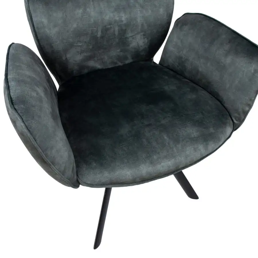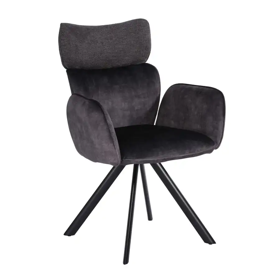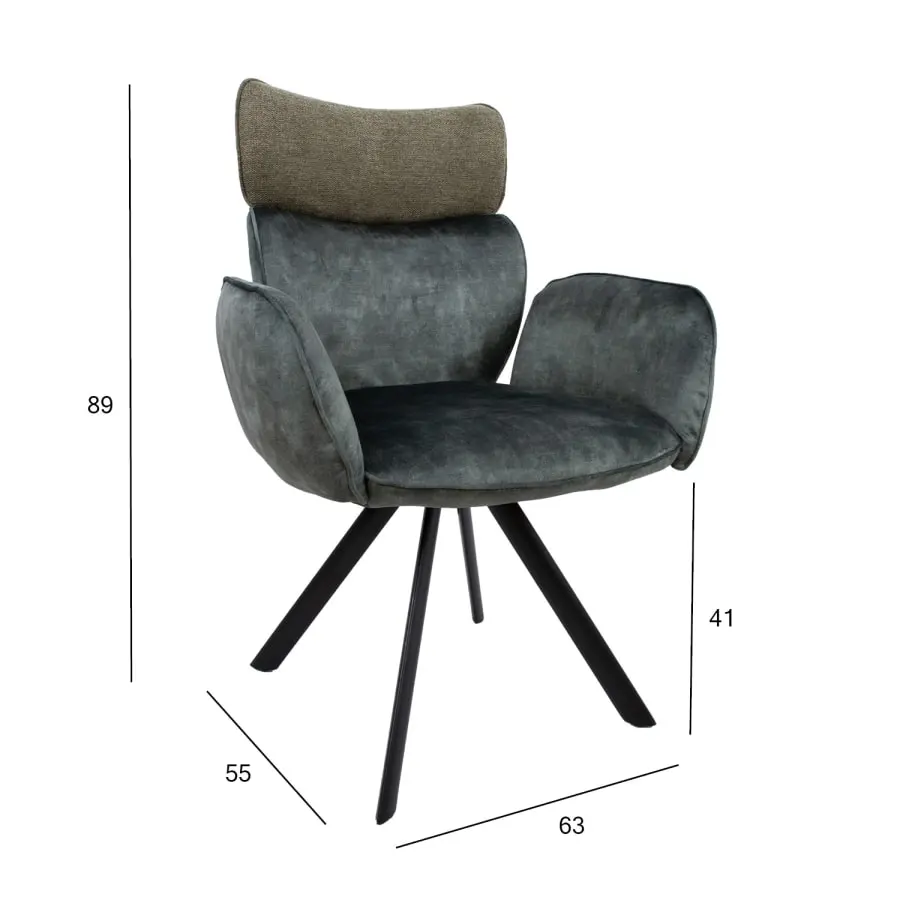 Chair EDDY with armrests 63x55xH89cm velvet. The convenient and stylish dining chair is covered with polyester fabric. The chair has armrests and its seat is upholstered. The fabric of the upper part of the backrest is a slightly different shade. The black matte metal legs are powder coated. Seat height 48cm, seat width 45cm, seat depth 42cm. Backrest height 47cm. Armrest height from the ground 64cm. Weight limit 120kg.