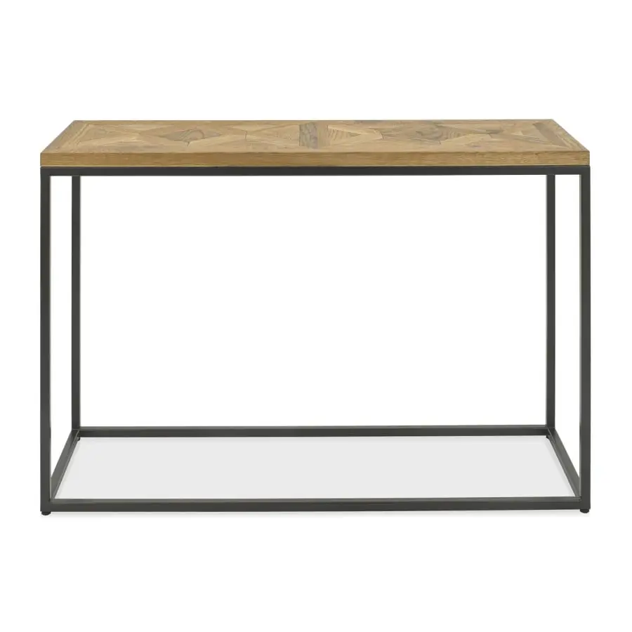 Snyggt smalt sidobord Indus, passar även för smalare korridorer! Vacker mosaik ekfanerad topp och grå metallram och ben. Omslaget borstas och avslutas med olja.