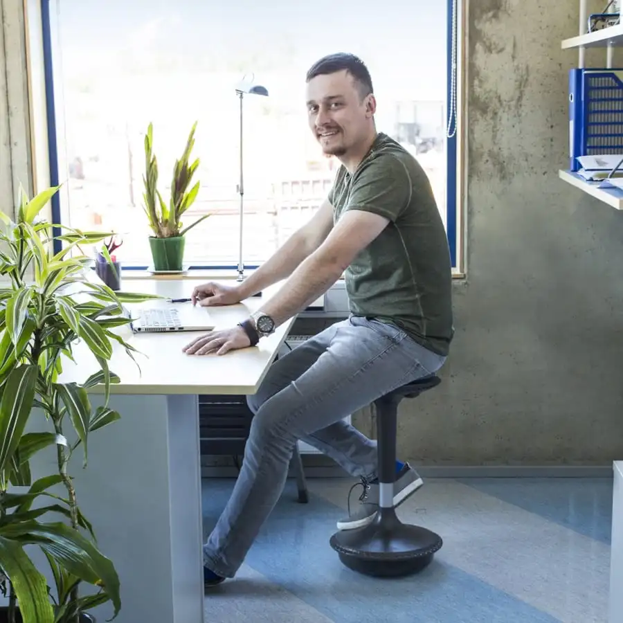 Arbetspall Just Fun. Ergonomisk kontorsstol. Tack vare det runda sätet är det lätt att sitta i stolen och efter användning återgår den till sitt utgångsläge av sig själv – Självbalanserande. Den formade gummibasen på basen garanterar ett bra grepp och stolen glider inte ut under sitsen.Sitthöjden kan justeras med en gasfjäder från 59,5 till 84 cm. Sitsen är klädd med grått tyg. Stål ram.