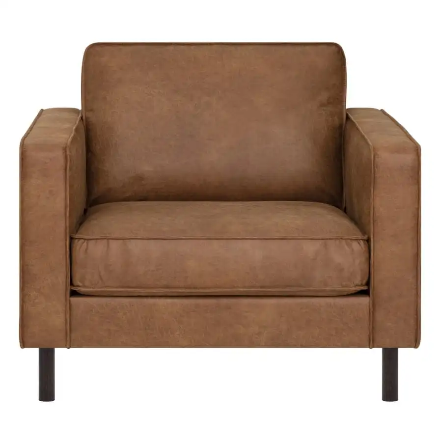 Sittdynan är lossad och kan inte vändas. Kudden är gjord av 120mm 35kg/m3, 20mm 35kg/m3 och 30mm 20kg/m3 skum. Stolen är klädd med limmad läder. Locket är avtagbart. Ryggstödsdynan är lös och vändbar. Den är fylld med polyesterfiber och skum. Fyllningen ligger i ett separat lock. Kuddfodralet är avtagbart. Ramen är gjord av massivt trä, plywood, hårdpapp och spånskiva. Ramen är belagd med 6mm 20kg/m3 skum. Produkten har en sicksackupphängning som är klädd med textil. Produkten har fyra ben av massivt trä. Färgen på benen är mocca. Höjden på benen är 14 cm. Sitsens höjd är 45cm, sitsens bredd är 70cm, sitsens djup är 54cm.
