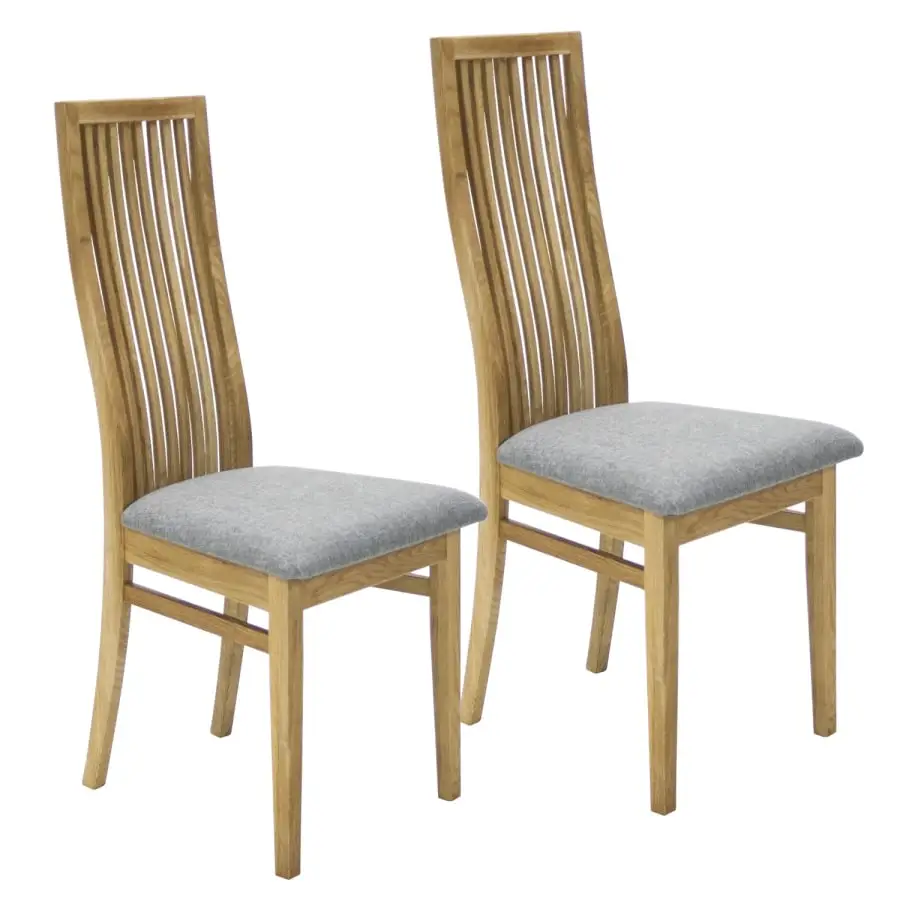 Retrostolar 2 st med högre rygg och vadderad grå sits. Tillverkad av ek och avslutad med olja. I priset ingår 2 stolar.