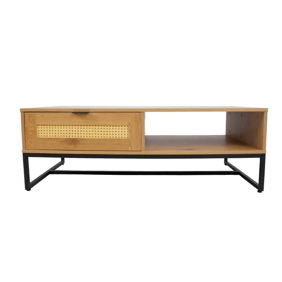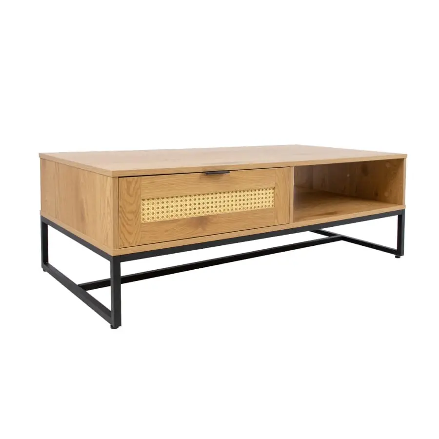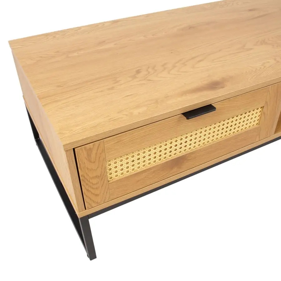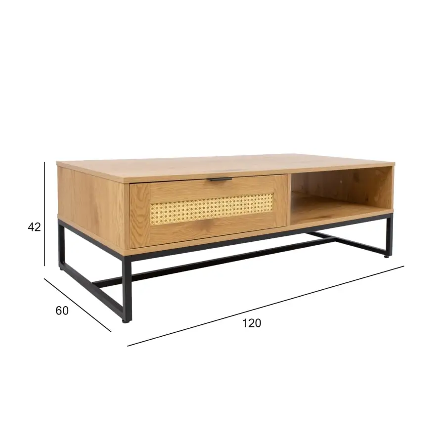 Coffee table SAILOR 120x60xH42cm, melamine, oak decoration. The product is made of melamine-coated furniture board, which is stylishly complemented by rattan-like plastic panels. The body of the stand is made of metal and finished with black powder paint. The height of the metal frame is 18.5 cm. The table has one drawer without rails that can be opened from both sides. The box has black metal handles. The width of the shelf next to the box is 57 cm and the height is 18.5 cm.