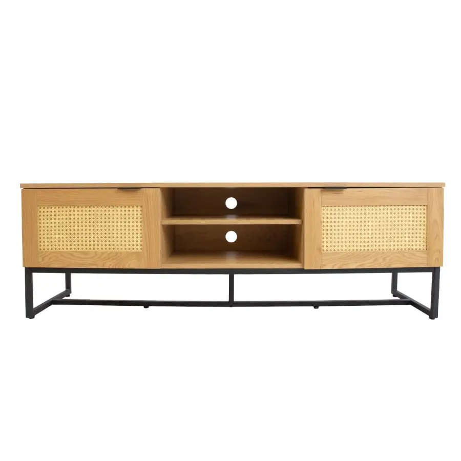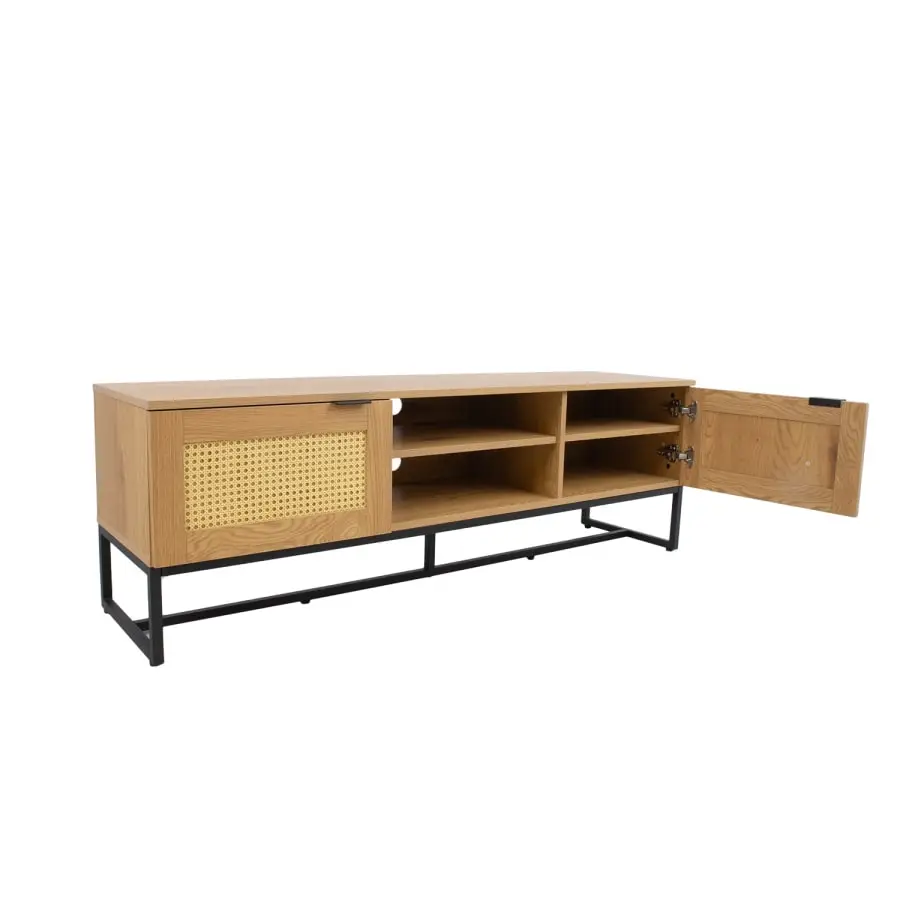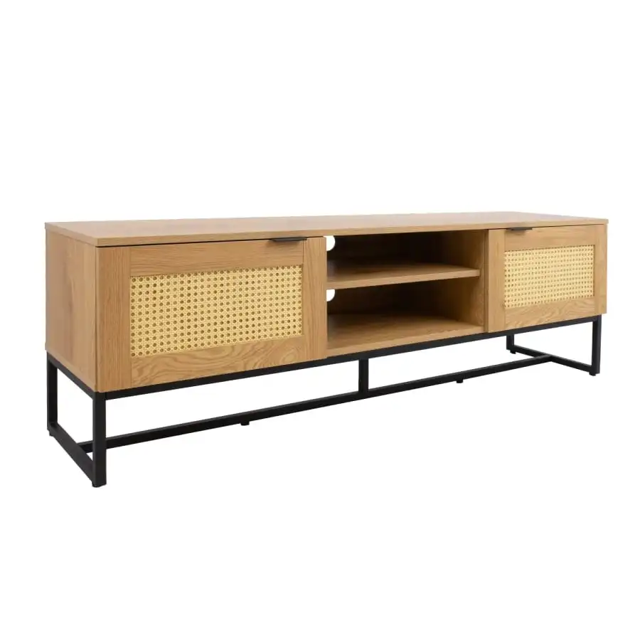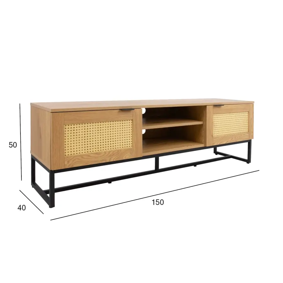 TV table SAILOR 150x40xH50cm, melamine, oak decoration. The product is made of melamine-coated furniture board, which is stylishly complemented by rattan-like plastic panels. The base frame is made of metal and finished with black powder paint. The height of the metal frame is 18.5 cm. The TV table has two quietly closing doors and an open shelf. The width of the middle shelf is 48cm, the height of the lower shelf space is 14cm, the height of the upper shelf space is 11cm. There is one intermediate shelf behind each door. The doors have black metal handles.