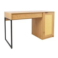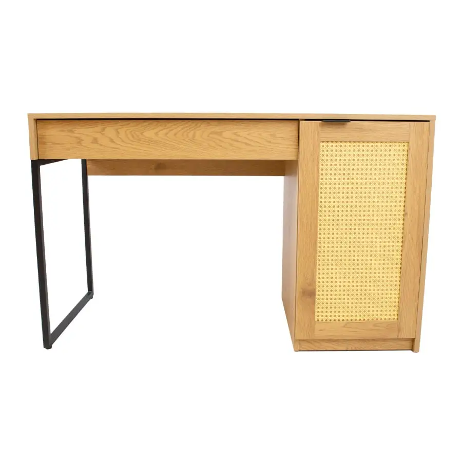 Produkten är tillverkad av melaminbelagd möbelskiva, som elegant kompletteras med rottingliknande plastpaneler. På andra sidan bordet står ett skåp med en tyst stängande dörr. Det finns en låda under bordsskivan som rör sig på metallskenor.
