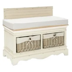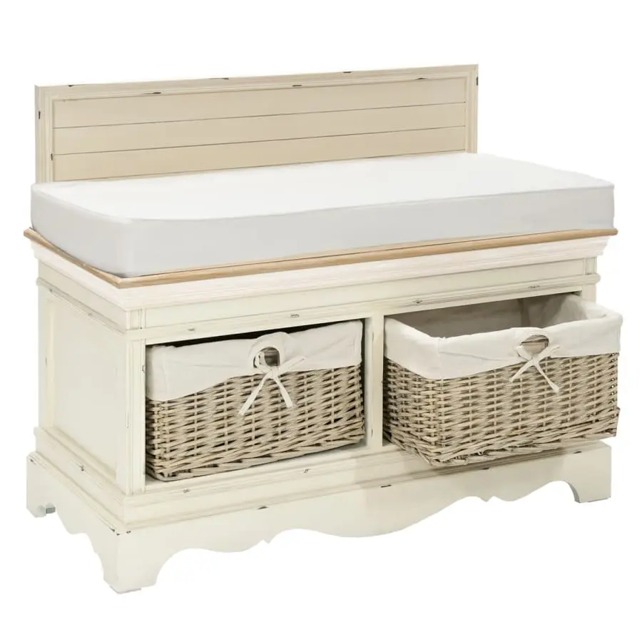 Cute little hall bench Samira! Beautiful braided baskets on the lower level complete the romantic look. Bench made of wood and MDF board. Antique white/brown in colour. There is also a plush seat cushion on top of the bench, which increases sitting comfort.