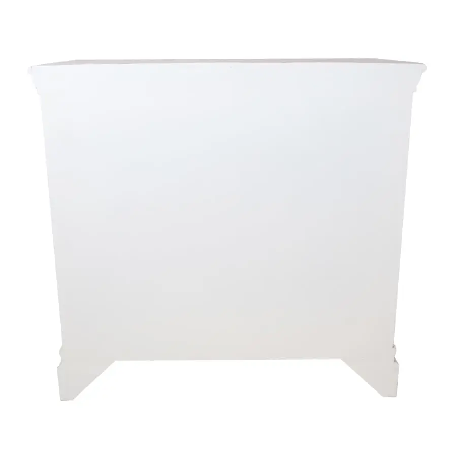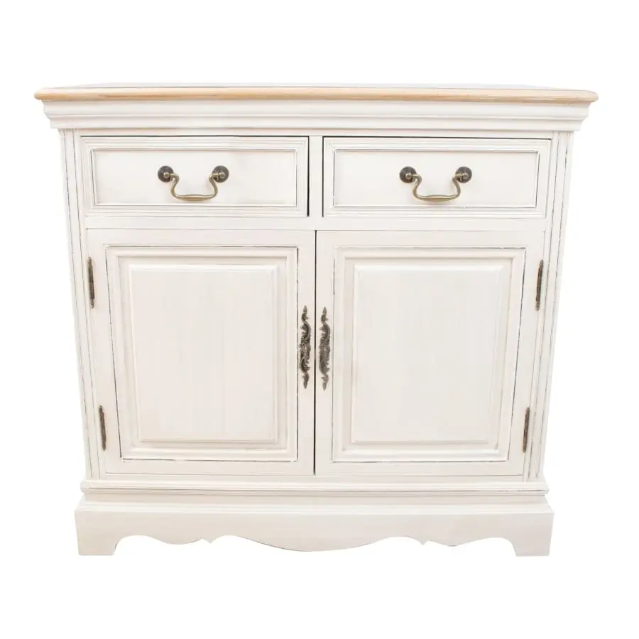Byrå SAMIRA med 2 luckor och 2 lådor, 85 x 39 x 82 cm. Toppplatta: antikbrun, ram/lådor: antikvit. 2 lådor och 2 skåpluckor med metallhandtag. Lådor utan skenor. Det finns 1 hylla i skåpet bakom de 2 luckorna. Vågig sockelkant. Trä: ask, paulownia, finish: målat.