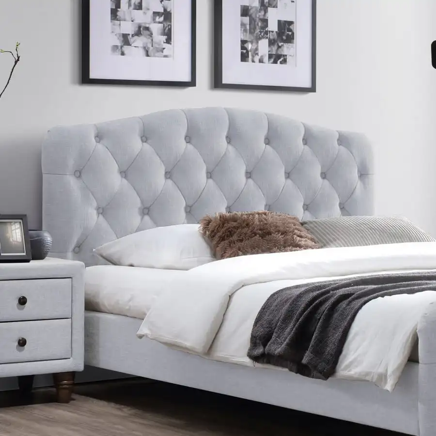 Upholstered bed frame SANDRA 160x200cm, light grey. The mattress is not included in the set. The slat base is included in the set. The total dimensions of the bed are 218.5x165xH105cm. Suitable mattress 160x200cm. The bed frame is made of MDF board and covered with polyester fabric. Wooden legs, color: brown.