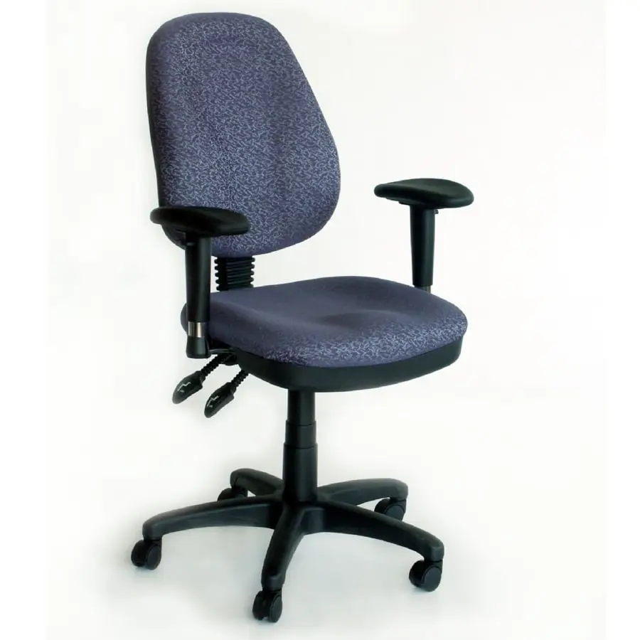 Sits: tyg, färg: mörkblå. Ytmaterial: sits och rygg: polyestertyg, 50 000 Martindale, färg: mörkblå. Kroppsfärg: svart. Mekanism och justeringar: ryggstödshöjd och lutning justerbar, sitshöjd justerbar med gasfjäder. Armstöd: material: polyuretan, höjd och lutningsvinkel justerbara. Bengaller: plastgaller, färg: svart. Hjul: golvbesparande gummihjul, stift: 11 mm. Mått: höjd 96-108 cm, sitthöjd 43-55 cm, sittdjup 48 cm, sittbredd 49 cm.