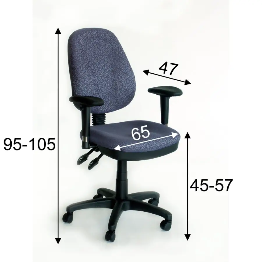 Seat: fabric, color: dark blue. Surface material: seat and back: polyester fabric, 50,000 Martindale, color: dark blue. Body color: black. Mechanism and adjustments: backrest height and inclination adjustable, seat height adjustable with gas spring. Armrests: material: polyurethane, height and tilt angle adjustable. Leg grid: plastic grid, color: black. Wheels: floor-saving rubber wheels, pin: 11 mm. Dimensions: height 96-108 cm, seat height 43-55 cm, seat depth 48 cm, seat width 49 cm.