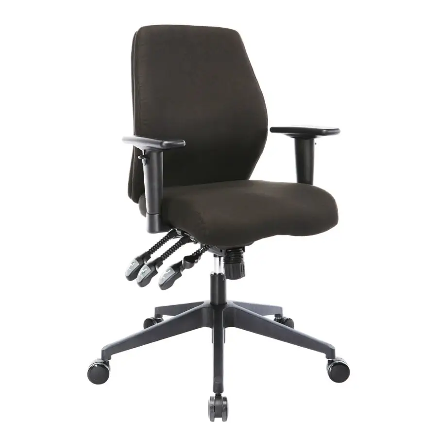 Fåtölj Smart med flera justeringsmöjligheter. Multifunktionell mekanism, sitsdjup och ryggstödshöjd justerbar. Sitshöjd justerbar med gasfjäder. Armstöden är gjorda av polyuretan och deras höjd är justerbar. Sits och ryggstöd klädda i slitstarkt polyestertyg, 30 000 Martindale. Bengaller av plast.