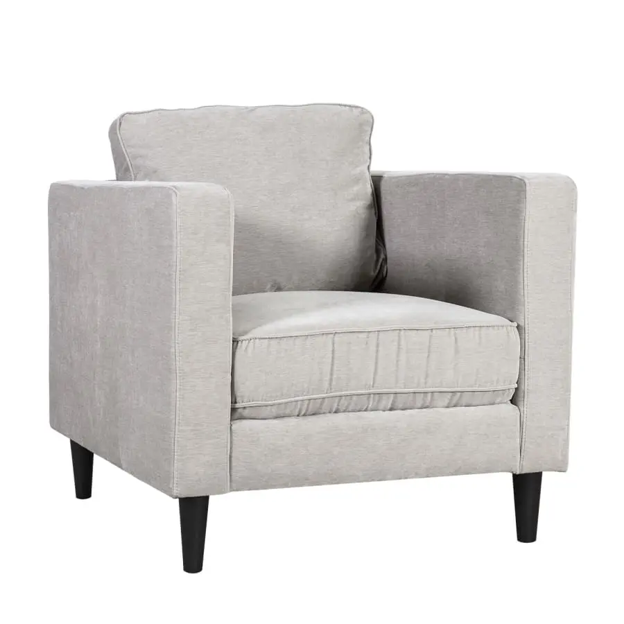 Spencer armchair with an elegant design. Frame made of wood and plywood. Zig-zag and pocket suspension guarantees sitting comfort. Polyurethane foam 28kg/m³ as padding, dacron and velvety soft polyester fabric upholstery. Dark colored plastic legs.